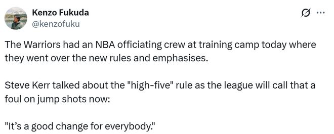 不过,克劳福德最重要的一件事,还是告诉球员们本赛季针对 “击掌防守”的判罚规则有调整,这将被视为犯规,目的是保护投篮球员。多家媒体转发了科尔的言论,认为库里有望从中受益。甚至有媒体认为,库里的罚球次数在新赛季有望翻倍。